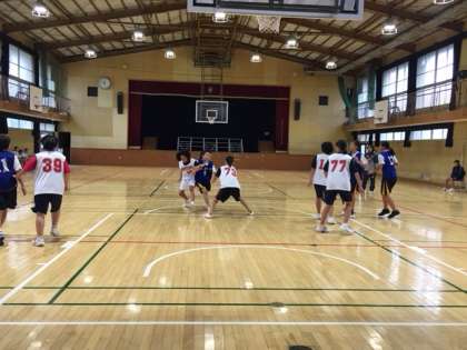 台風前で雨が降りしきる中ですが、体育館からは元気な声が聞こえてきます。今朝は、女子バスケットボール部が体育館で練習試合を行っています。対戦相手は、我孫子中学校です。