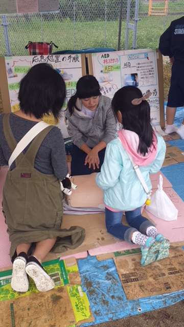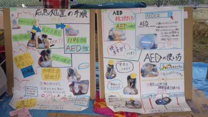 生徒会保健委員会では、今日、沢ノ町グランドで開催されました、「すみよし区民まつり」に参加しました。住吉区合同保健委員会の一員として、AED講習会や応急処置についての広報活動を行いました。雨の中でした、大勢の皆さんにお越しいただきました。