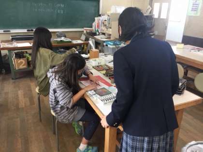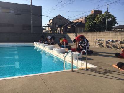 最後は美術部、葉っぱのモチーフ作り、水泳部、プールサイドで体力作りです。プールは水温が低くて泳げませんが、薬剤が効いていて、まだ青々としています。