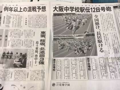陸上競技部男子長距離チームは、明日12日開催される「大阪中学校駅伝」にシード出場します。シード校となっていますが、大阪市駅伝でもすでに3位の実績を誇り、今回も上位入賞を狙っています。今日はその大会について大きく新聞報道もされ盛り上がっています。スタートは明日12日11時20分、長居公園外周コースです。応援、よろしくお願いします。