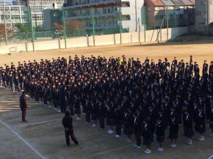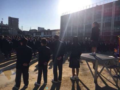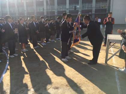 11月、3回目の全校集会です。晩秋の晴天の下、外での集会も肌寒さが増してきました。表彰伝達では、野球部に大きな優勝旗を渡すことができました。