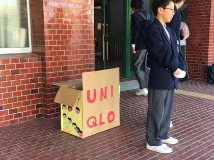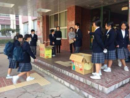 生徒会では ユニクロが行っている世界的な支援活動、「服のちからプロジェクト」の取り組みに協力しています。今週いっぱい、子ども古着の回収を登校時に行っています。すでに段ボール箱には多くの支援が寄せられています。この後も、ご協力よろしくお願いします。