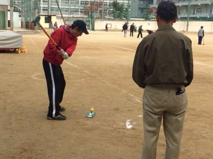 学校グランドでは、テスト前で部活のない校庭で、清水丘町会のグランドゴルフ大会が開かれています。運動場いっぱいのコースで思い思いにゴルフを楽しまれています。