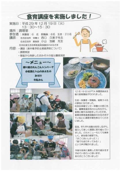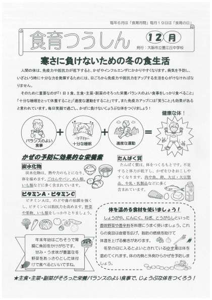 大阪市教育委員会から、保健委員会を通じて、「食育つうしん12月号」が発行されています。緑字部分をクリックいただくと大きくご覧いただけ、プリントもできます。