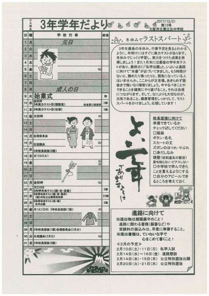 受験を控えて、3年生では1月すぐに、最後の重要な実力テストもあり、早めの行事予定のお知らせをしています。そのため一足早く、学年だよりが発行されました。