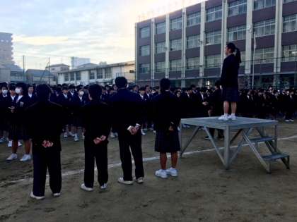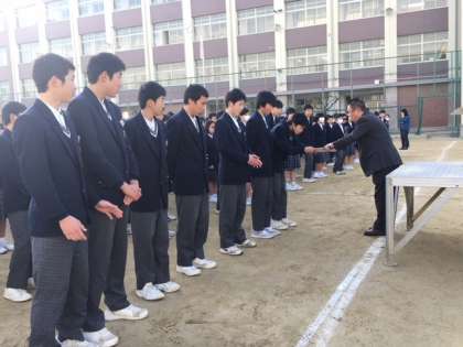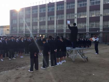 今日15日(月)、3学期初めての全校集会を行いました。少し肌寒い中でしたが、陸上駅伝の表彰状の伝達などを行いました。