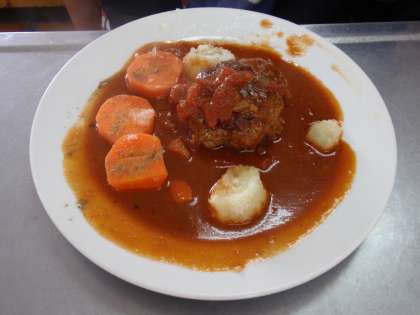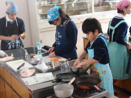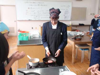 材料を切り、フライパンで炒め、ひき肉と混ぜ合わせて形成していきます。本日のお料理は「煮込みハンバーグ」です。うまく調理できて、美味しくいただきました。