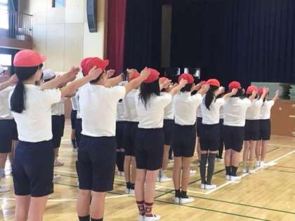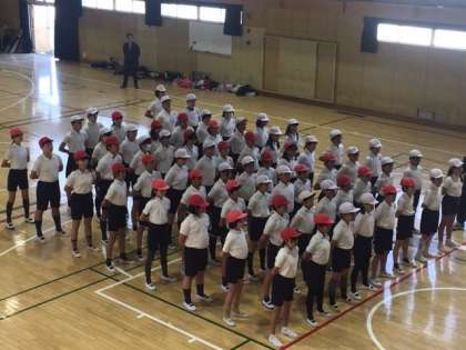 先月の墨江小学校に続いて、今日は校区のもう1校、清水丘小学校6年生の皆さんが、中学校の体育−集団行動を学びました。中学校の広い体育館では、小学生の皆さんも最初から緊張気味でしたが、気合の入ったきびきびとした動きができました。