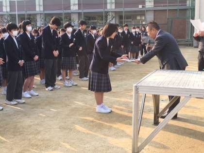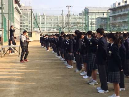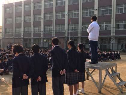 雨上がりのさわやかな天候となったグランドでは、全校集会が行われました。表彰伝達では、技術家庭科の作文入賞、吹奏楽部のソロコンテスト入賞、美術作品では、大阪市作品展での入賞などの伝達を行いました。