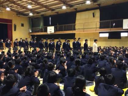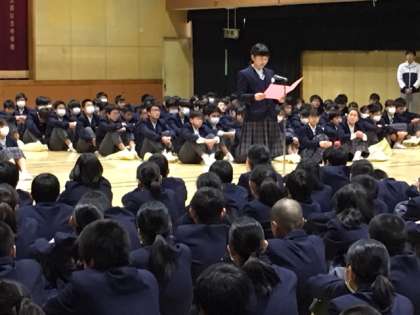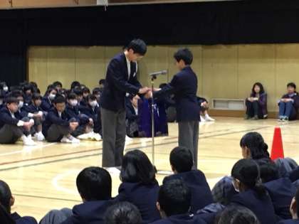 スライドの後は、在校生と3年生のメッセージ交換です。在校生からは、記念品のコサージュと感謝の言葉が、3年生からは思い出やアドバイスなど、多くが伝えられました。印象に残ったのは、本当に中学校3年間の短さを説いてくれた部分でした。1年生からいろいろなことをしっかりとやらないと間に合わないという言葉にはとても重みを感じました。今年も、いい卒業式が迎えられると思います。