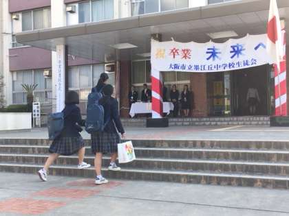 今日14日(水)、青空が広がる晴天の下、「平成29年度第39回卒業証書授与式」が行われました。今日は、187名が卒業証書を手にします。午前9時、卒業生が登校、式が始まりました。