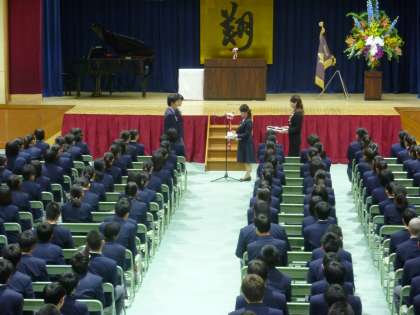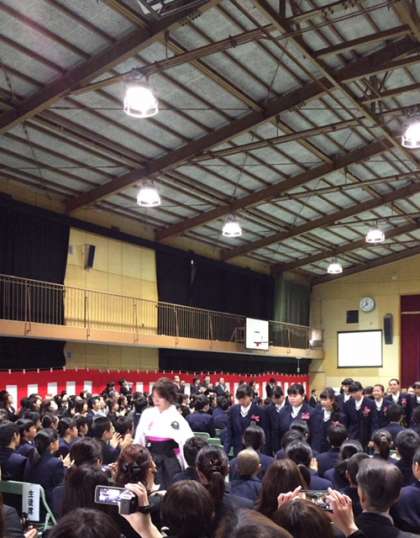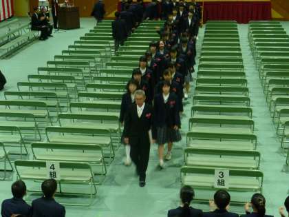 保護者PTAの皆さんから、記念品をいただき、卒業式が終わり、退場です。涙をためた3年生が担任の先生による最後の引率で退場します。