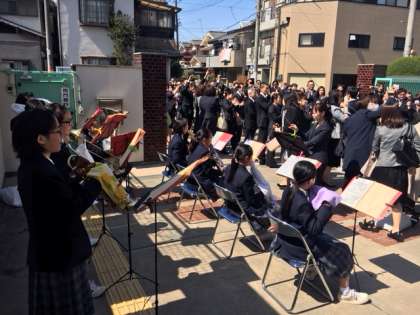 外では大勢の皆さんが、校門で見送ってくれます。吹奏楽部の演奏で、涙から笑顔に変わって学校を去ります。ほんとうにうれしそうです。
