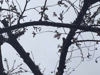 学校園の桜が、一輪、開花しました。今日の雨で、つぼみが膨らみ、さらに開花が進みそうです。今年は例年になく桜が早く咲きそうです。