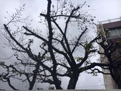 3/20 学校園 「桜−雨でつぼみが膨らみ一輪開花」