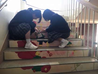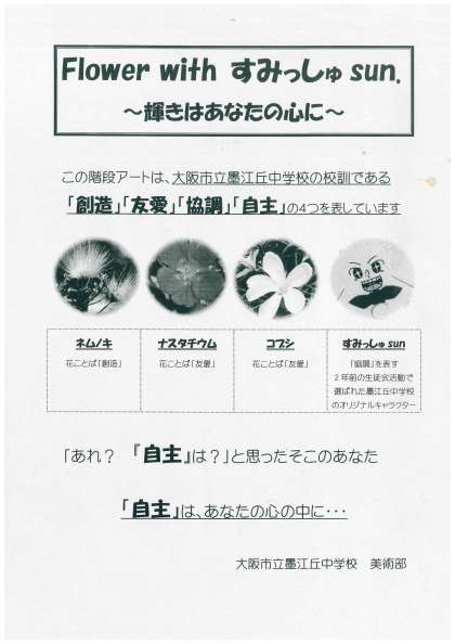 3月に完成しました、美術部、階段アートについて、テーマを補足します。今回のテーマは「校訓 創造 友愛 協調 自主」をモチーフにして、表現したそうです。