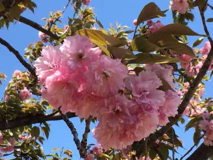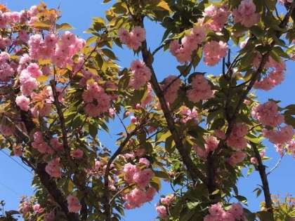 ソメイヨシノが終わり、今、学校園では「ヤエザクラ(八重桜)」が満開です。そのピンク色の花びらは、今日の青空に映え、ひと際、鮮やかできれいに見えています。