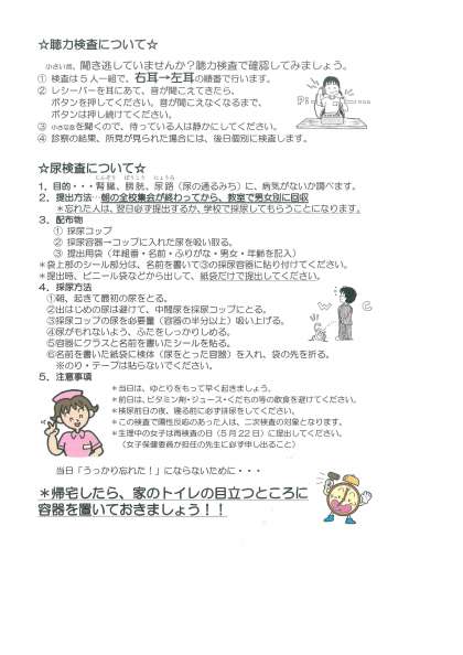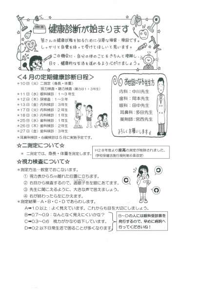 保健室から 「保健だより4月号」が配布されています。健康診断の予定や各種検査の予定が記されています。