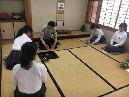 茶道部では、1年生の新入部員を迎え、指導の先生や、先輩から作法を習っています。緊張しながらの練習ですが、一生懸命がんばっています。早くお点前が披露できるようになってほしいと思います。