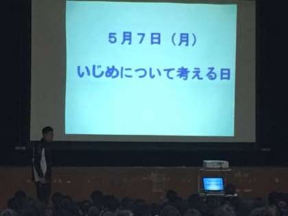 今日、5月の第一月曜日は、全校集会日に合わせて、「いじめについて考える日」という日が、大阪市一斉に制定されています。全校集会ではスライドを使ってその考え方を身近な題材から考えてからみました。子どもたちも真剣な表情で、本校にはいじめなどないこと、なくなることを誓いました。