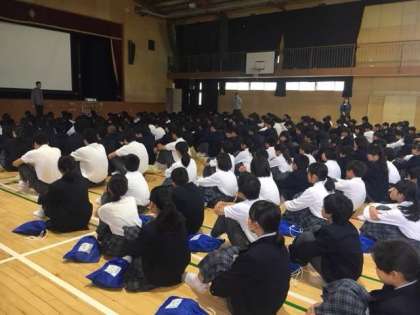 今日は、5月最初の全校集会です。表彰は、美術部の作品「階段アート」(ホームページで紹介)が表彰状をいただきました。引き続き「ライン」の学習会があります。