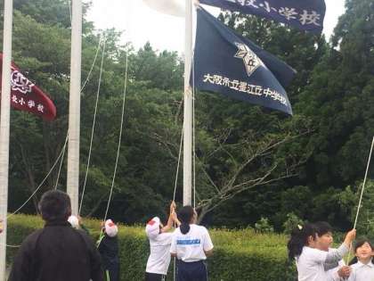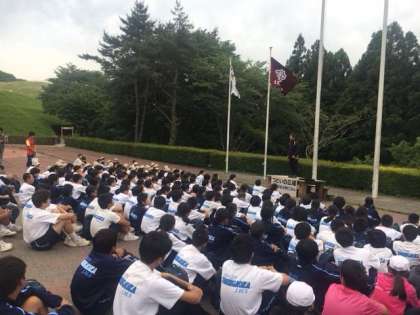 午後4時半からは、広場で夕べの集いが行われます。今日は、宿泊します奈良、大阪の小中学校4校が集いました。それぞれの代表が、学校紹介をしました。