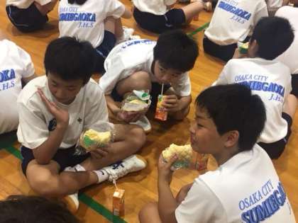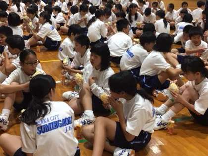 5/28 1年生「一泊移住」 レクリエーションの後は軽食時間です。