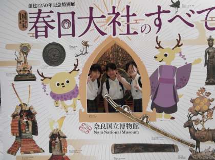 美術部では、5月26日(土)、週末を利用して「奈良国立博物館鑑賞会−国宝春日大社のすべて」を見学に出かけました。博物館では、国宝に圧倒されながら見学できました。また奈良公園では、鹿に触れ合うこともできました。