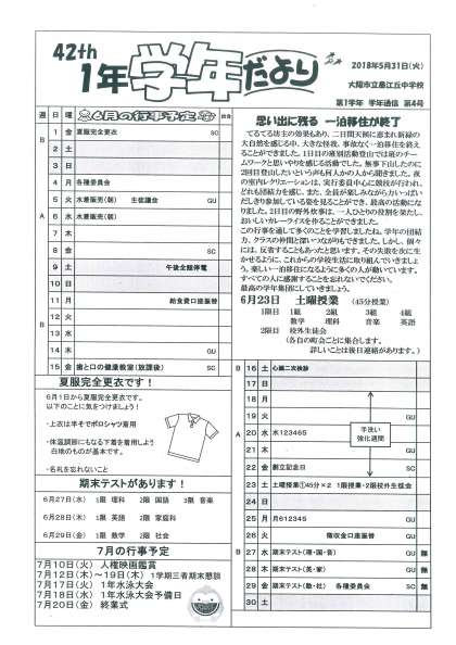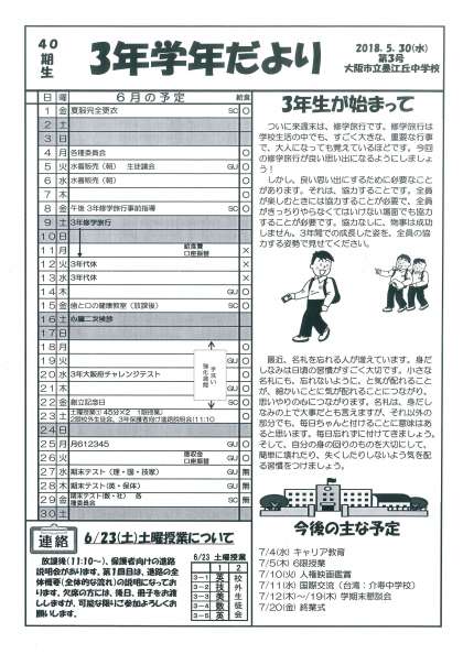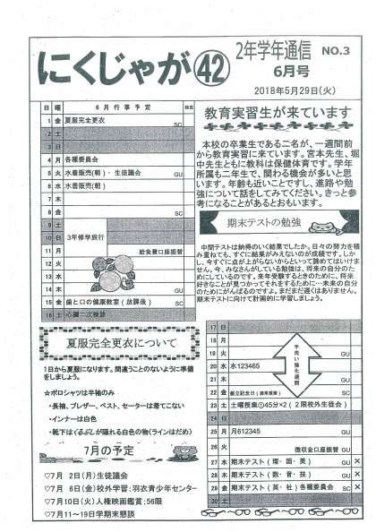 6月に入りました。今日からは夏服登校になります。また、各学年、「学年だより6月号」が配布されています。学年スケジュールが詳しく掲載されています。