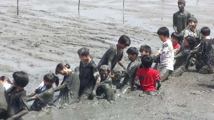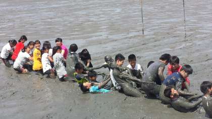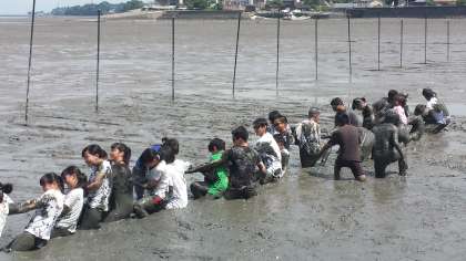 6/9 3年生 「九州修学旅行1日目−干潟体験「ガタリンピック−綱引き大会1」