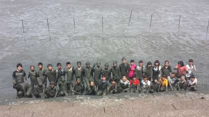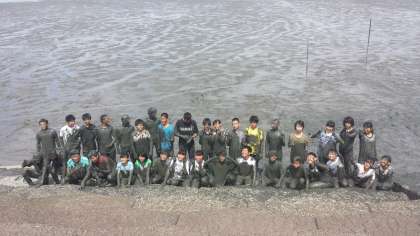 6/9 3年生 「九州修学旅行1日目−干潟体験「クラス写真を撮ります。2」