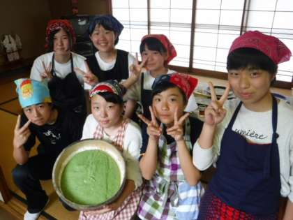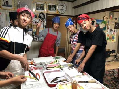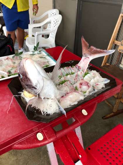 青島名物、お煮しめ作りにも挑戦です。地引網で獲れたばかりの、なんと、鯛の刺身です。