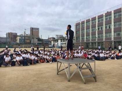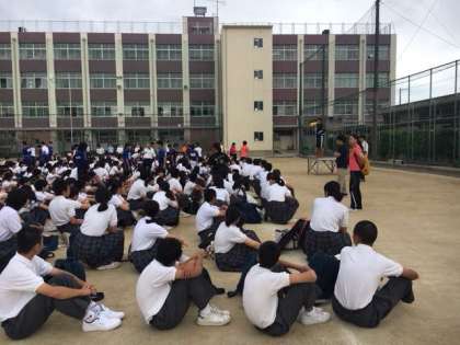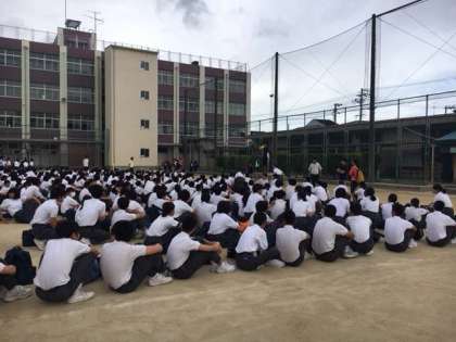 本日、朝7時58分の強い地震のため、登校している生徒は全員、運動場に避難しました。安全確認を行ったところ、登校生徒に異常はなく、学校被害もないことが分かりました。お昼前、教育委員会の指示により、昼食後、下校となりました。