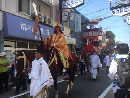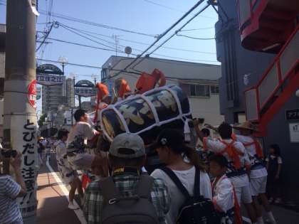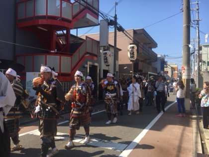 校区、住吉大社では今日、夏祭り最終日を迎えました。この日は、大社から堺宿院まで船渡御行列が行われます。重さ3トンの大神輿(おおみこし)を担いで、大和川を渡り、堺まで運ぶものです。