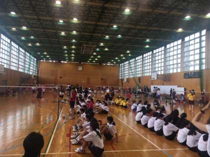 バドミントン部では、今日から2日間、7ブロック地区大会に臨んでいます。会場は、住吉中学です。バドミントンは風の影響を受けてはいけないので、体育館はすべて締め切られて行われます、会場いっぱいの選手で、中は大変な暑さになります。