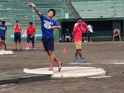 今日はシティライトスタジアムにて、男子2選手が「砲丸投げ」で出場します。11時30分の本番に向けて念入りにアップしています。これまでの練習の成果を発揮し、好記録が出ることを期待しています。健闘を祈ります。