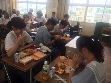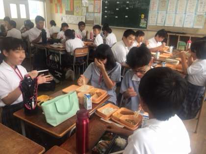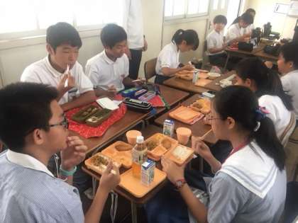 そして、いよいよ学校に到着、給食体験から日本の中学校生活が始まりました。教室では、早速、なかよくお話をしながら、お昼ご飯を楽しそうに食べる姿が見られました。