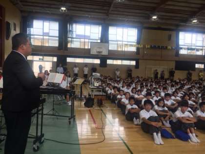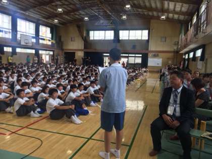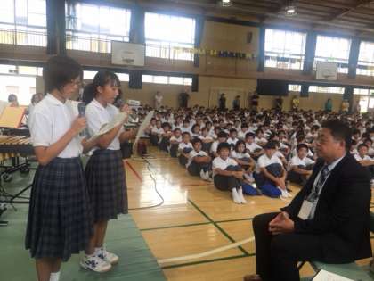 次は、学校全体での歓迎式です。体育館では吹奏楽部の国歌演奏で、式が始まりました。両校校長あいさつに続いて、生徒会と生徒代表による歓迎と訪問のあいさつが行われました。