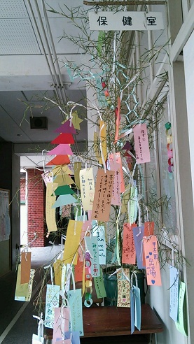 今日は七夕です。保健室前に大きな笹が飾られました。