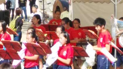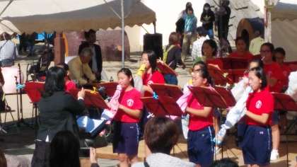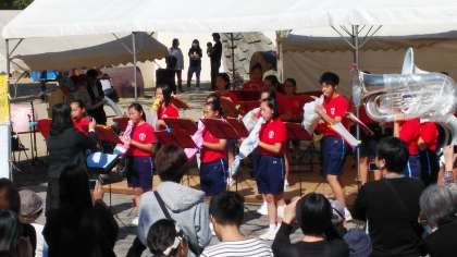 パレード終了後、舞台で演奏し3曲披露しました。舞台をおりる間際に、アンコールの声があがり、さらに1曲を皆さまにお聞かせしました。吹奏楽部は地域活動に貢献してくれました。