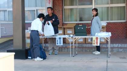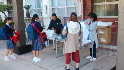 昨日と今日、朝に玄関で、1年生に向けに、体育の授業で使う「柔道衣」の販売を行いました。