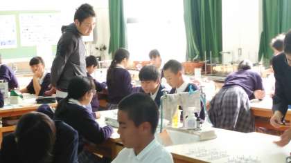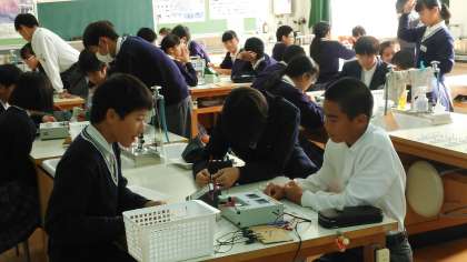 2年生は、理科の授業で、「電気の性質や流れ」などを学習しています。実験では、電源装置や電流計や電圧計を用いて回路をつくり、「直列回路」と「並列回路」での電流や電圧の変化を比較しました。
