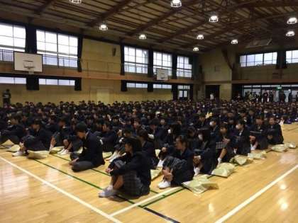 朝、体育館で「全校集会」が行われました。「校内ではちゃんと名札をつけましょう」との話と、体育大会で各クラスが作成した「学級応援旗」の表彰が行われました。