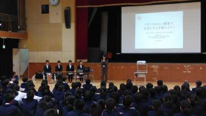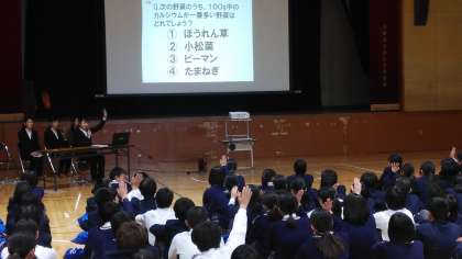 1年生は、6限目に、大阪市大と連携して進めている「食育出前授業」を受けました。6月に実施したアンケート結果をもとに、大阪市大の4名の学生の方々から「食」と「学力」と「体力」に関する報告と改善点などを教えていただきました。また、保健委員会からも「食」に関するクイズがあり、楽しい学びとなりました。みなさん、バランスのとれた食事を3食しっかりと食べましょう!とのことでした。