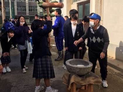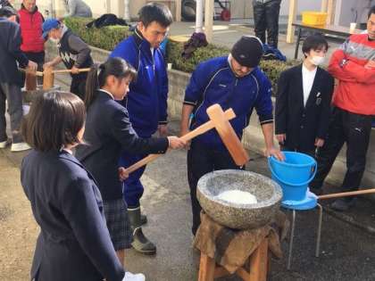 本校では、いくつかの伝統行事があります。今日はその一つ、「もちつき・かるた大会」が行われました。PTA、丘友会の皆さんの協力を得て、今年も2千個のお餅を用意してくださいました。
