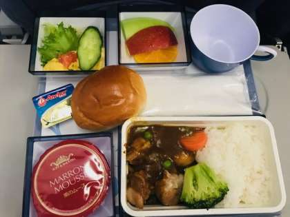 出発式を終えたメンバーは、記念写真に納まり、飛行機に乗り込みました。機内では、機内食が提供されます。