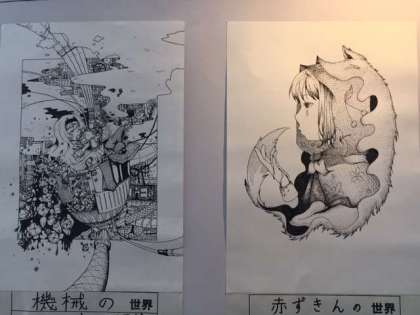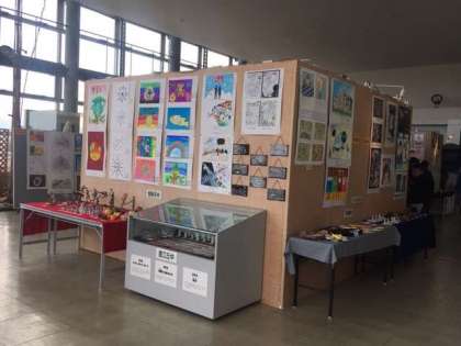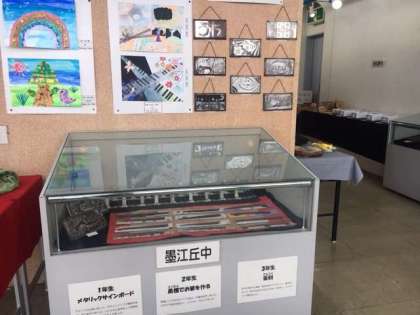本校からは、1年生メタリックサインボード、2年生黒檀(こくたん)で作るお箸、3年生篆刻(てんこく)を出品しています。また点描画の2作品はさらに近畿大会の部に出品されています。この展示は、2月11日まで行われています。