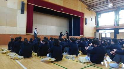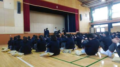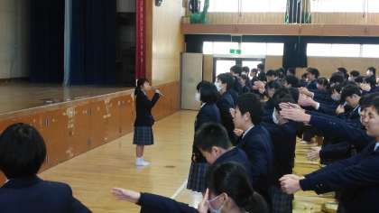 週明けは、定例の「全校集会」を行います。生徒会長さんの呼びかけで集会が進行します。今日は教頭先生からの講話と3つの表彰がありました。