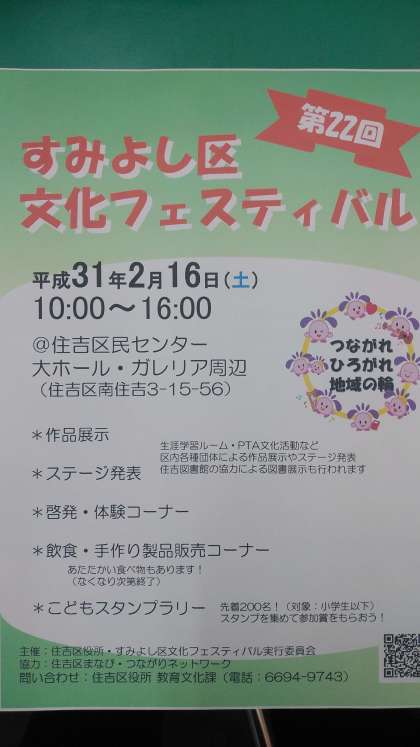 明日2月16日(土)に、住吉区民センターにて、「第22回すみよし区文化フェスティバル」が開催されます。本校PTAからも、成人文化さんで、7月に活動された「手芸講習会」で作られた作品を出展するなど、参加いたします。開催時間は、午前10時〜午後4時までとなっております。お時間がございましたら、多数の皆さまのご来館、お願いいたします。