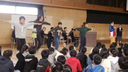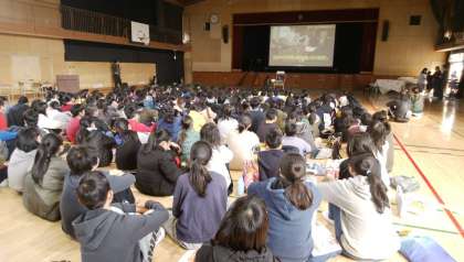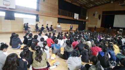 吹奏楽部の「音楽鑑賞会」に引き続いて、生徒会による「中学校説明会」を行いました。生徒会の生徒たちが、寸劇で中学校の学校生活を紹介しました。